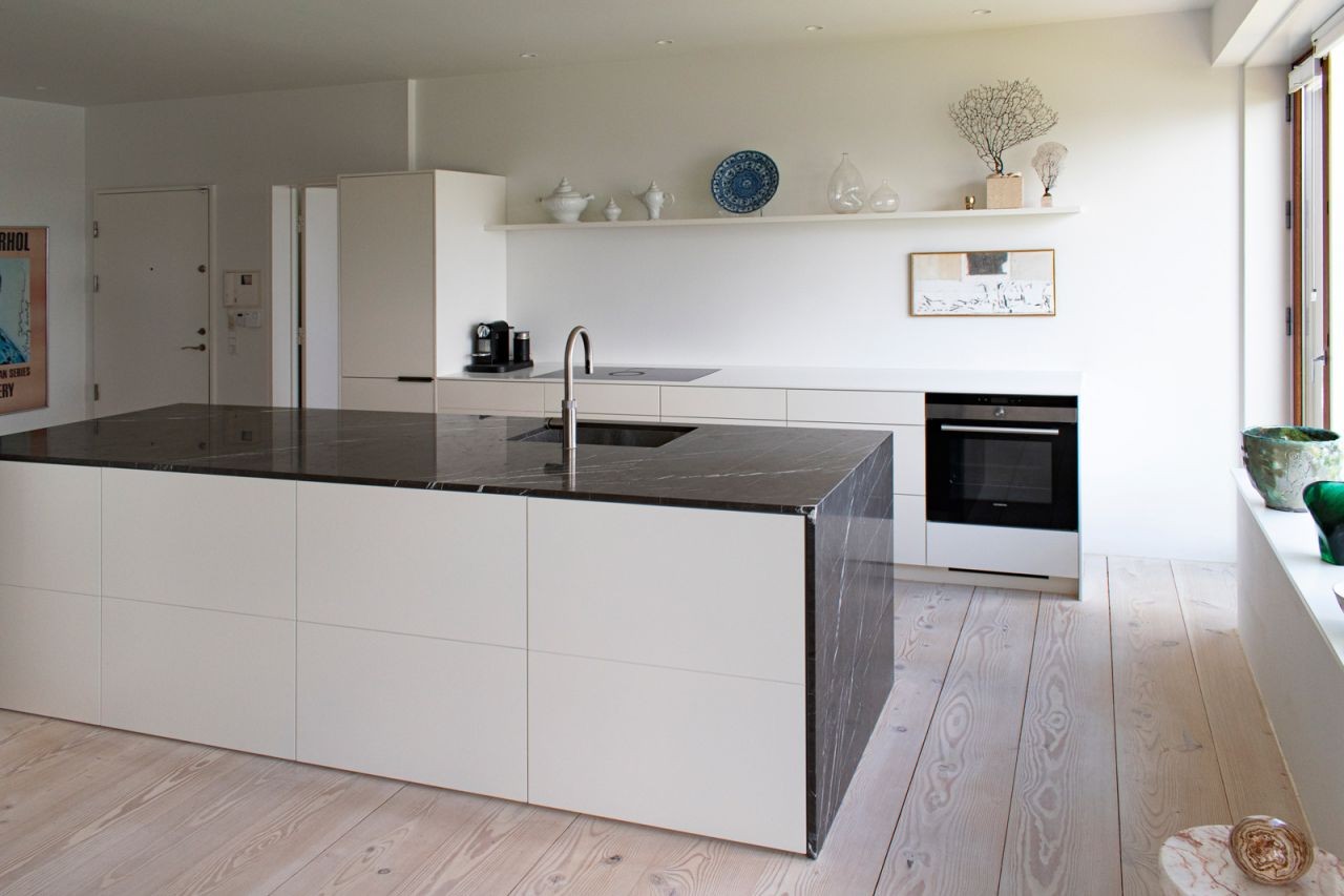 Til denne stilrene lejlighed med udsigt til havnen, er der valgt et diskret og enkelt køkken med hvidmalede låger uden greb og hvid bordplade i Corian. Som kontrast til det hvide look, har køkkenøen fået en smuk bordplade i en sort marmor med klare hvide tegninger.