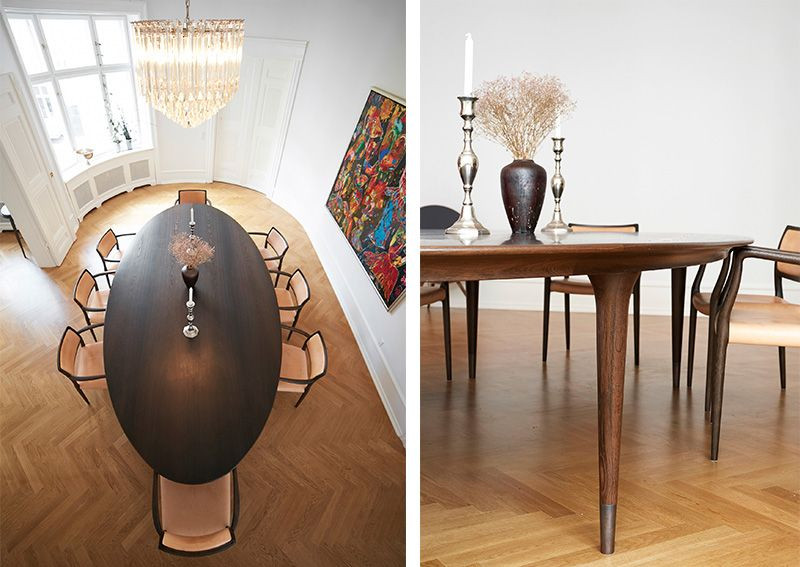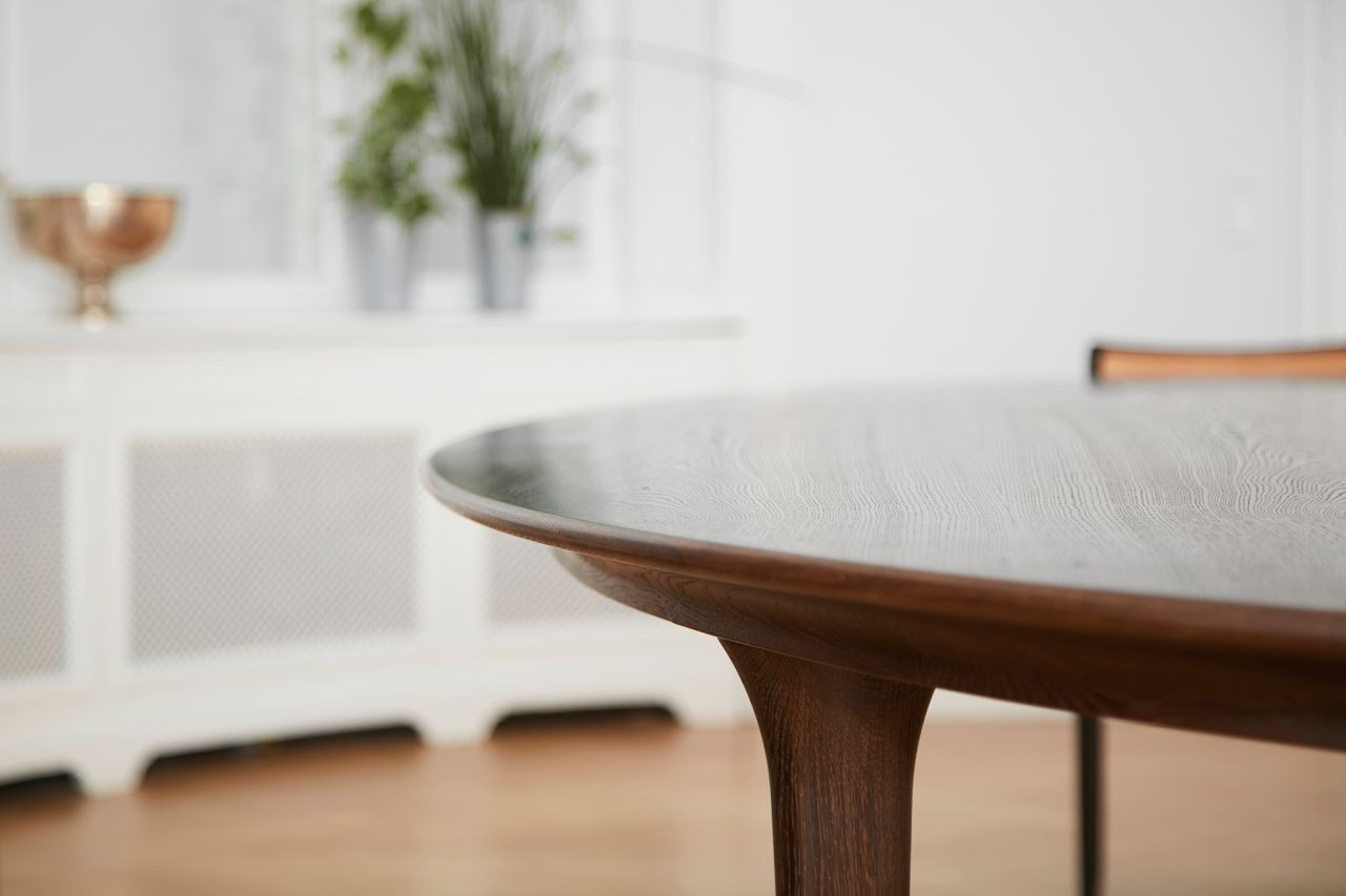 Denne smukke lejlighed har en stor spisetue med en buet bagvæg. Kundens drøm var et bord i røget eg der blev designet til rummet og tilpasset dets form og størrelse. Bordet blev detaljeret i tæt samarbejde mellem snedkermester og kunde.